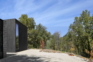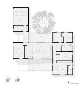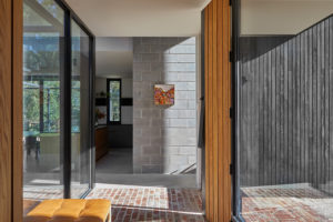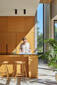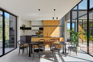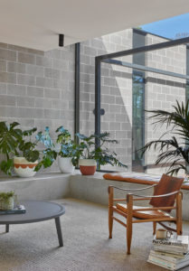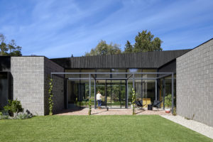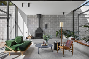 The services, sleeping and living zones of the house are conceived as separate wings, arranged on site to maximise light and view access. Both the services and sleeping wings are constructed out of concrete blockwork, anchoring the home to the site. The solid elements bookend a lightweight timber and glass living pavilion, providing privacy and protection where it’s needed and a connection to the views and landscape where it’s desired.