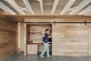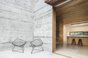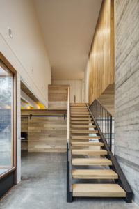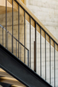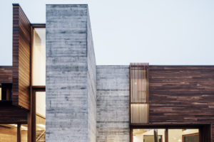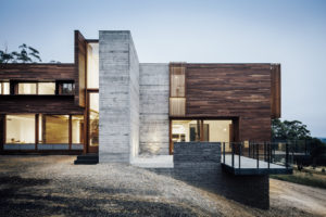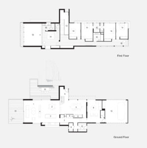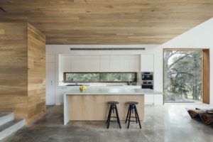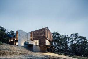 The form is a simple linear block, divided internally into a series of horizontally and vertically connected open spaces. The envelope uses naturally fire-resistant Spotted Gum cladding, insulated in-situ concrete panels, and split-face concrete block to suit the site’s BAL29 bushfire rating. The cladding will be left to weather, reflecting the greys of the surrounding bush.